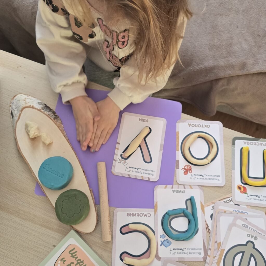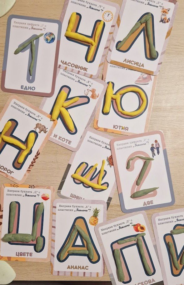 Детето поставя пластилина върху картата, оформя буквата с ръце и следва контурите ѝ. Така то вижда, пипа и създава буквата само.